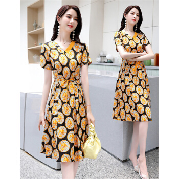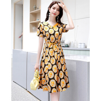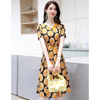 连衣裙>>莺飞雪仿真丝连衣裙女2020夏季流行新款时尚条纹衬衫裙短袖夏天气质雪纺裙子 黑底黄 M(建议80-100斤)