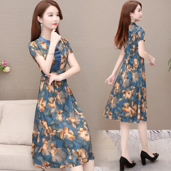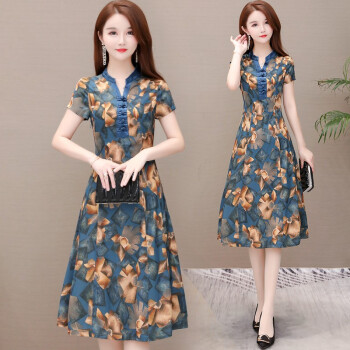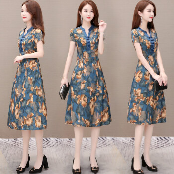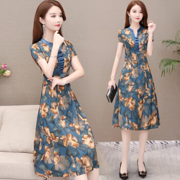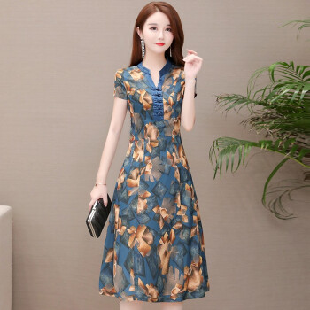 格素凡 连衣裙女夏装2020新款韩版V领雪纺碎花长裙阔太太旗袍式中长款显瘦印花过膝蕾丝裙子大码女装潮 蓝色(F92) 女-L 建议体重90-105斤 |