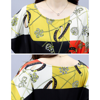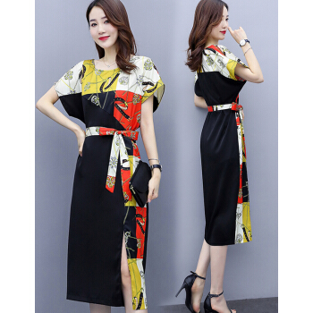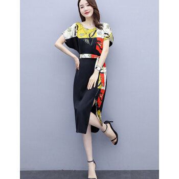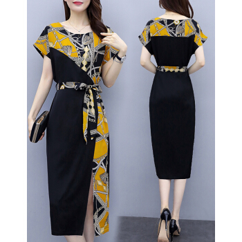 婪澈连衣裙女2020女装夏季新款时尚印花收腰直筒显瘦气质短袖裙子夏天 黄花 请下正确尺码