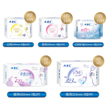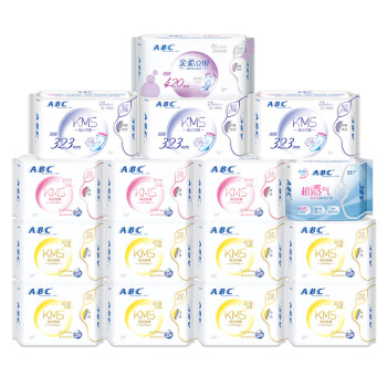 卫生巾>>ABC KMS纤薄棉柔日夜组合16包122片(日用64片+夜用24片+加长9片+超长3片+护垫22片)卫生巾套装