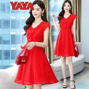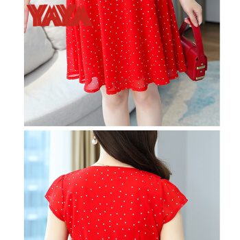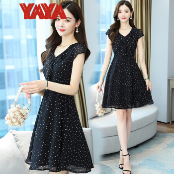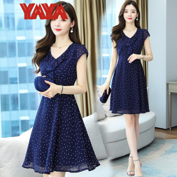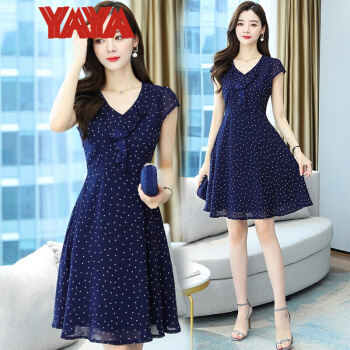 连衣裙>>鸭鸭服饰(yaya)波点雪纺连衣裙女2020年女装夏季新款v领短袖荷叶边气质裙子女夏 蓝色 请选择正确尺码
