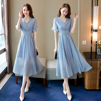 信和祥雪纺连衣裙女2020夏季流行新款简约V领通勤荷叶袖中长款纯色短袖夏天气质裙子 粉色 L