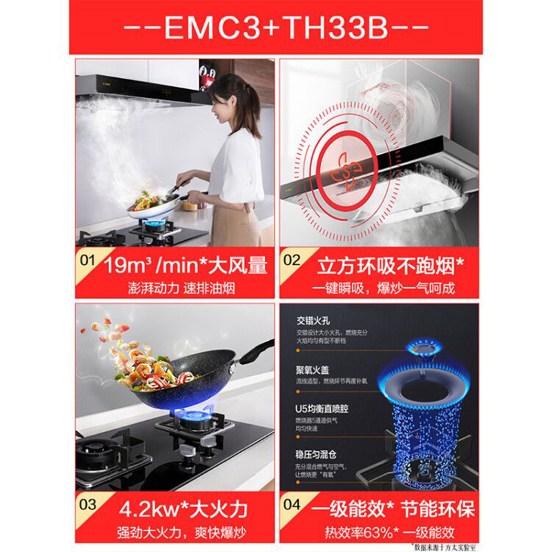 EMC3+TH33B 一键瞬吸云魔方 19m3/min*大风量 100S*全速排烟 烟灶套装【不锈钢+钢化玻璃/黑色】