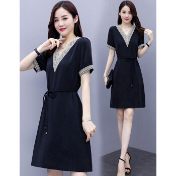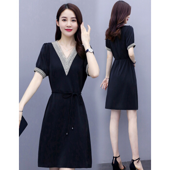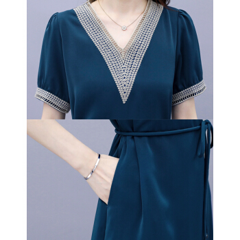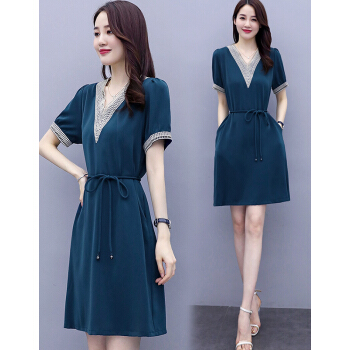 婪澈连衣裙女中长款2020女装夏季蕾丝镂空v领气质新款流行短袖显瘦透气裙子 蓝色 请下正确尺码