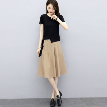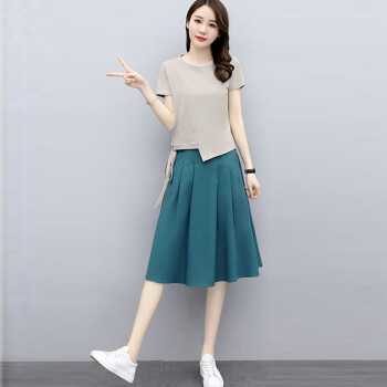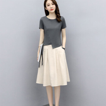 莱倪晟纳连衣裙2020年新品女装夏季短袖时尚洋气宽松两件套中长款裙子 灰色上衣+米白裙子 请拍正确尺码 |