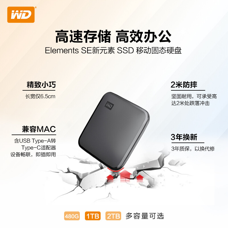 硬盘>>西部数据(WD) 1TB 移动固态硬盘(PSSD)Elements SE新元素 SSD 便携迷你坚固防震 存储备份笔记本手机电脑
