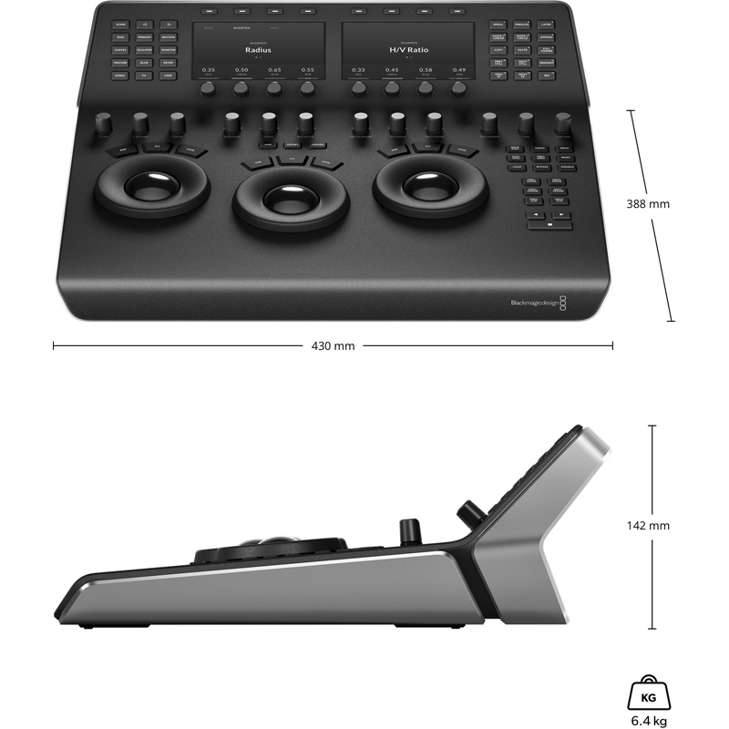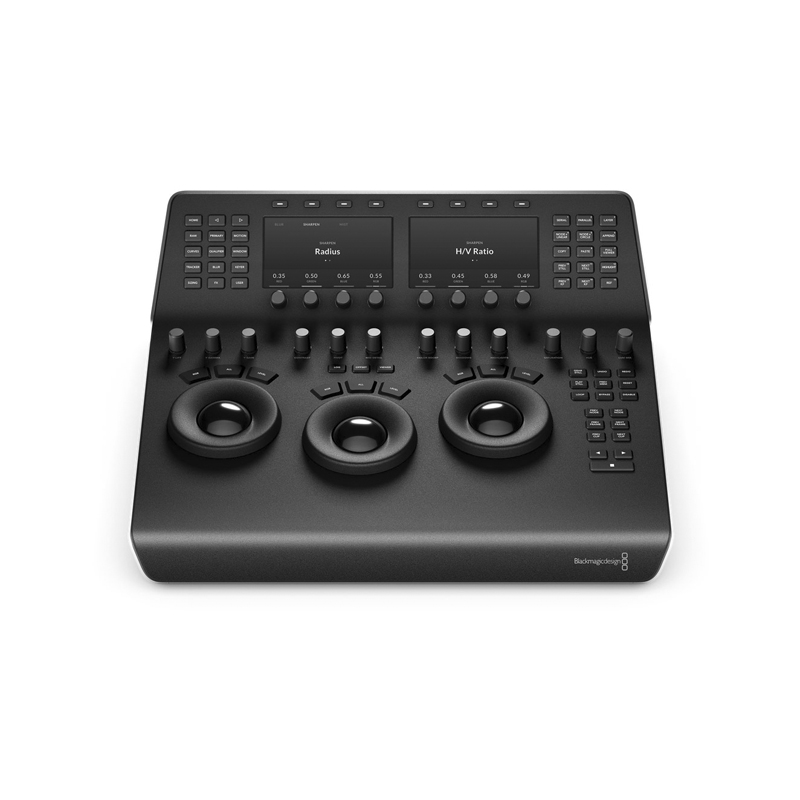 紧凑专业的硬件调色台,搭载3个触感灵敏的精准轨迹球,12个用来控制主要工具的旋钮,正面配有两个5英寸屏幕,8个多功能旋钮和8个多功能按钮,并专设各类功能按键用来切换工具、节点式操作、抓取静帧、时间线导航等操作!