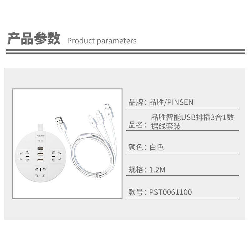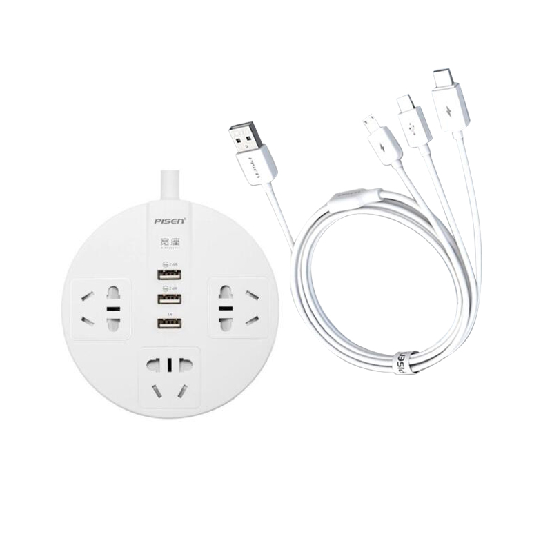 智能USB排插3合1数据线套装【ABS/白色】